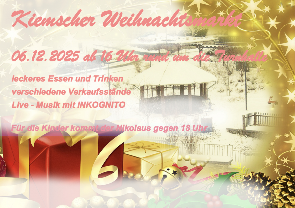 Am Wochenende des 2. Advents (6. Dezember) findet der Weihnachtsmarkt statt. Dieses Mal rund um die Turnhalle. Hier wird es wieder einige Buden und Stände mit den verschiedensten Angeboten geben. Für das leibliche Wohl wird selbstverständlich gesorgt sein. Auch der Nikolaus wird uns wieder besuchen. Um die musikalische Untermalung des Abends kümmert sich wie in den letzten Jahren dankenswerterweise das Duo Inkognito aus Kümbdchen.